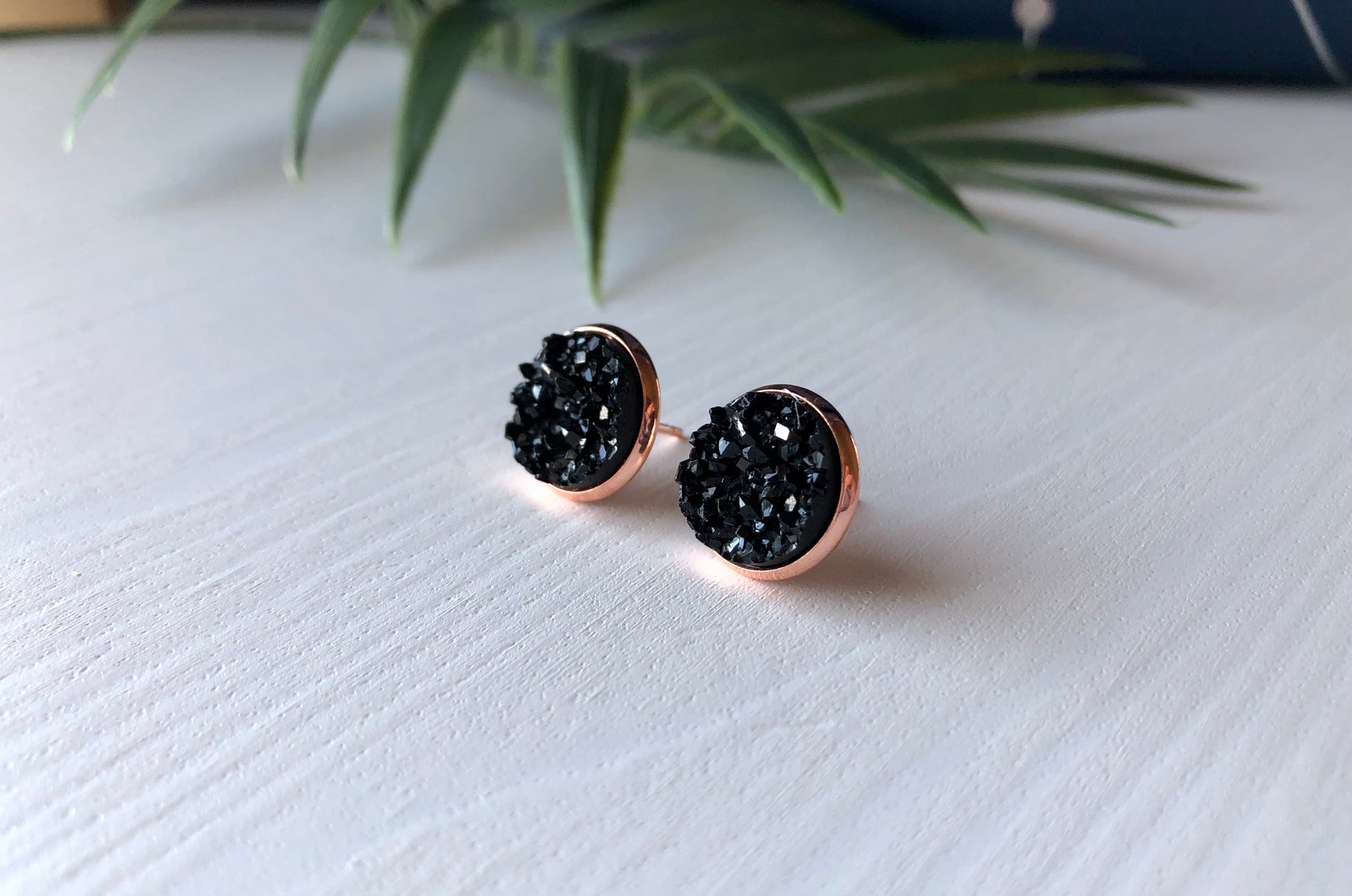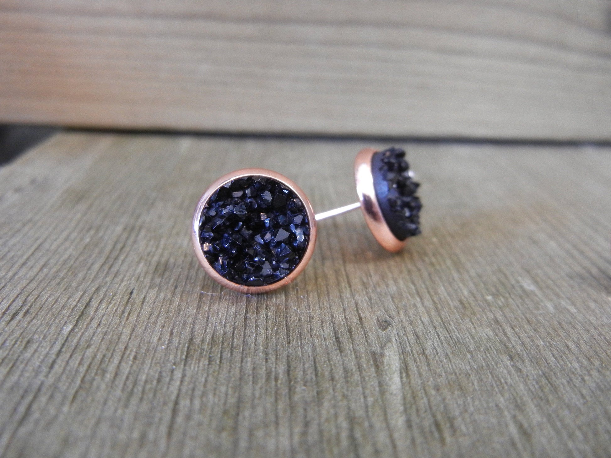 Black Druzy Stud Earrings - 12mm Stone on Rose Gold